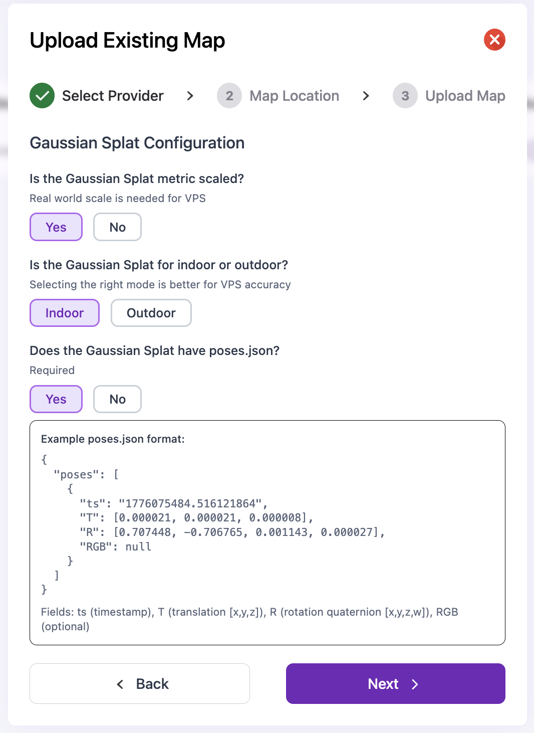 <figure><img src="https://3163433004-files.gitbook.io/~/files/v0/b/gitbook-x-prod.appspot.com/o/spaces%2FokTDI7QVY04Zvb1pQ8Ry%2Fuploads%2Fgit-blob-3cb7e1eed6262f6060e6fb1d21cceea70ac0ebc7%2Fmultiset-upload-gs-config.png?alt=media" alt="" width="375"><figcaption><p>Gaussian Splat configuration — metric-scaled / indoor-outdoor / poses.json.</p></figcaption></figure>