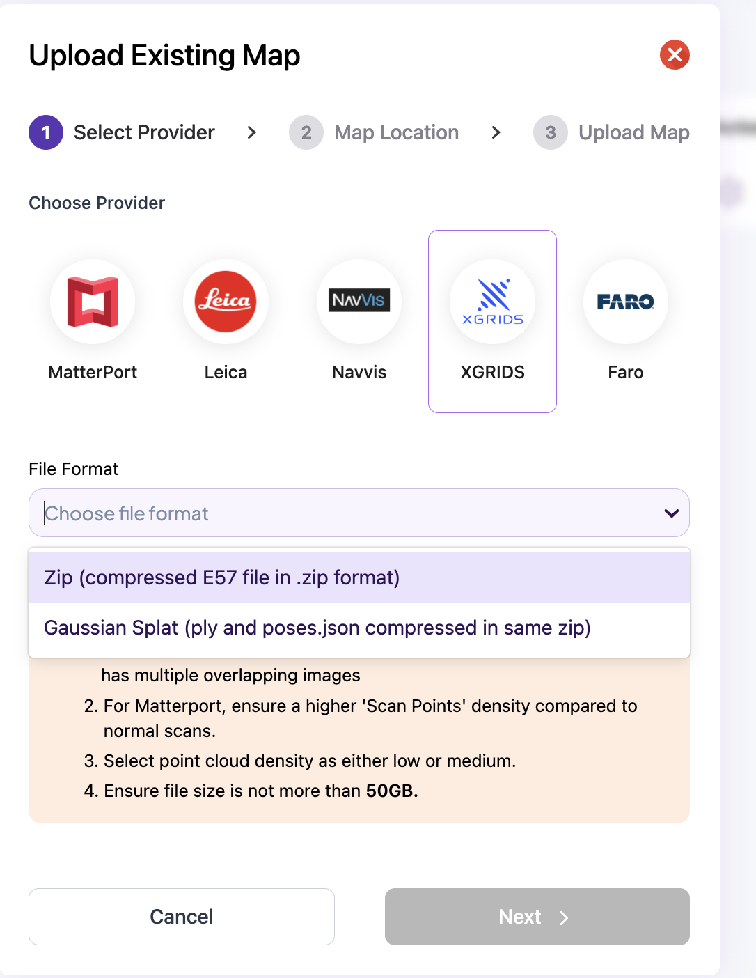 <figure><img src="https://3163433004-files.gitbook.io/~/files/v0/b/gitbook-x-prod.appspot.com/o/spaces%2FokTDI7QVY04Zvb1pQ8Ry%2Fuploads%2Fgit-blob-82018630a86f03ad96d1c6d023f898d9ff665ce2%2Fmultiset-upload-gs-xgrids.png?alt=media" alt="" width="375"><figcaption><p>Upload Existing Map — XGRIDS + Gaussian Splat file format.</p></figcaption></figure>