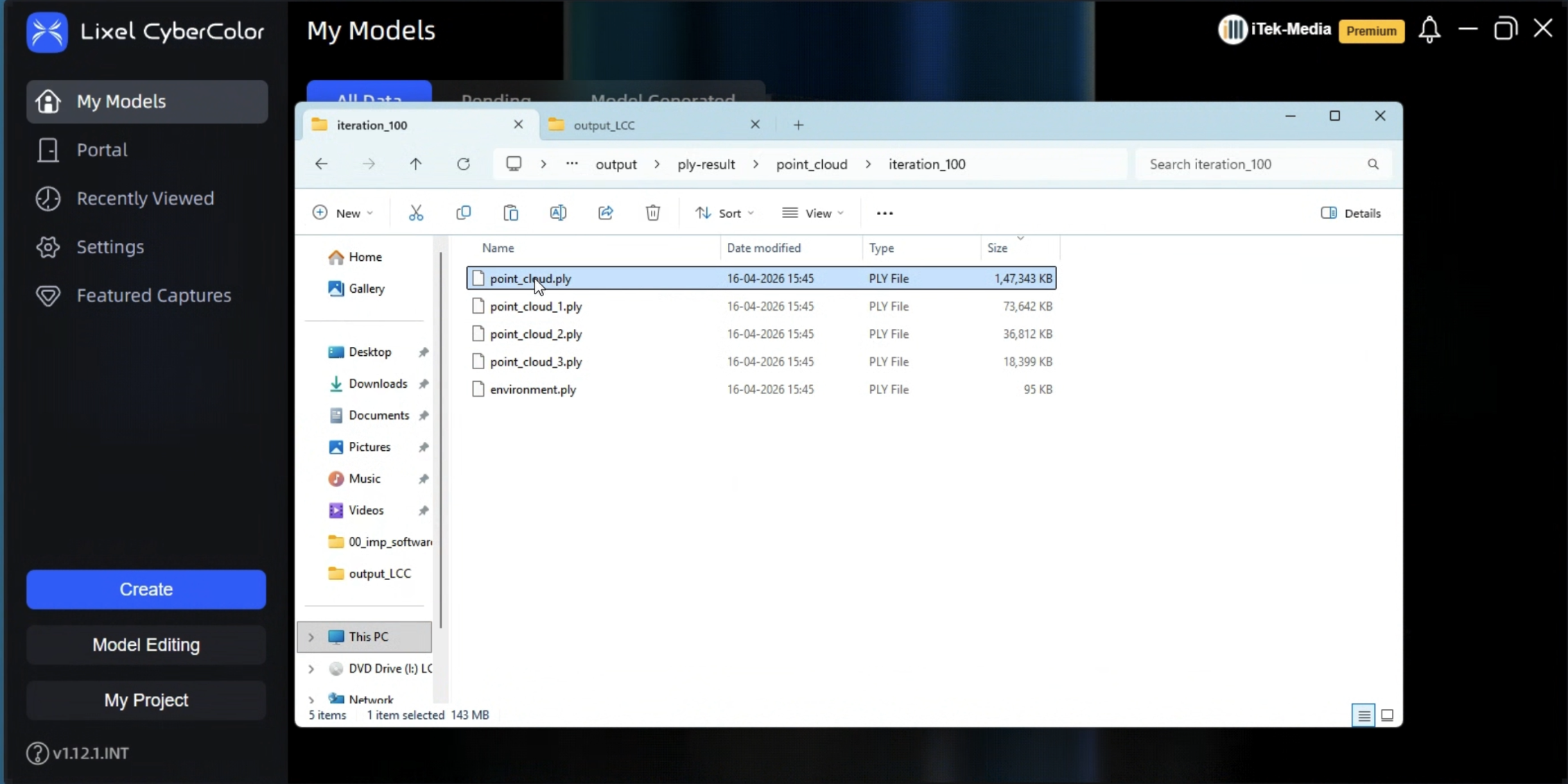 Once the reconstruction finishes, Lixel CyberColor writes the point cloud (`.ply`) outputs under the project's output directory: